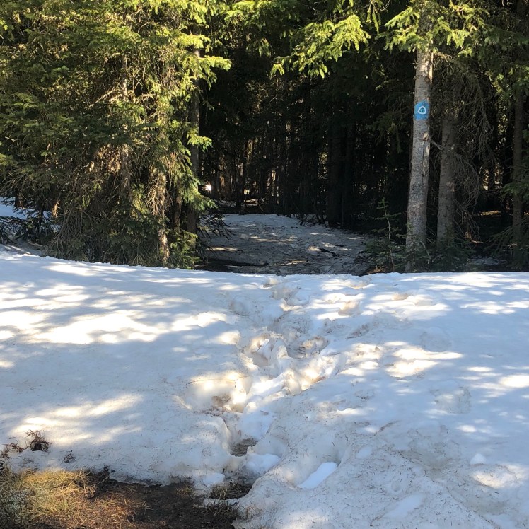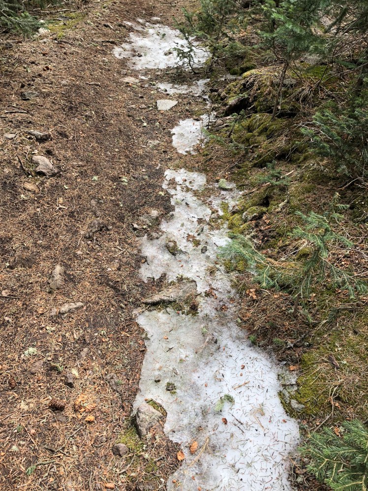 Signs of snow on the trail during the descent: