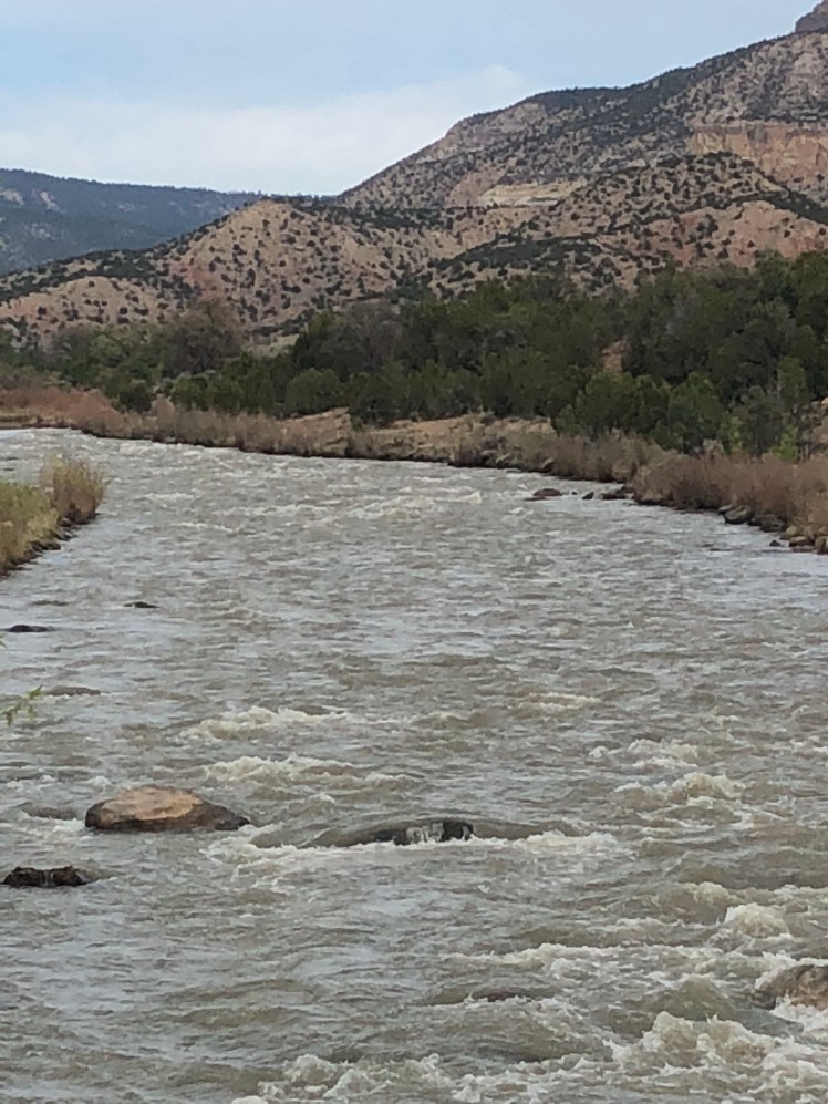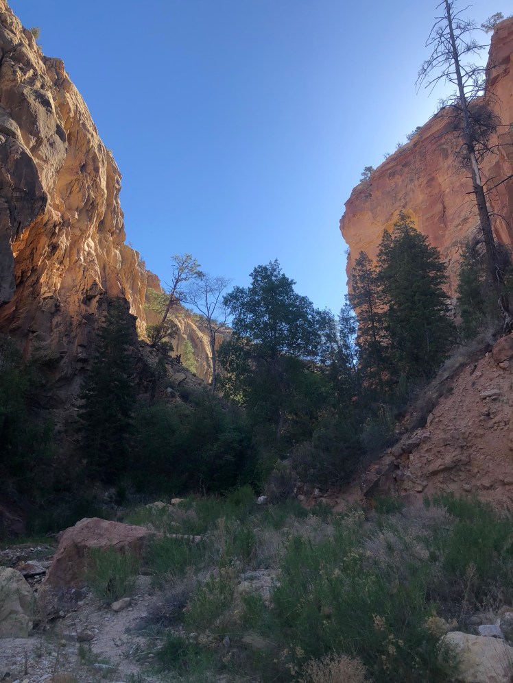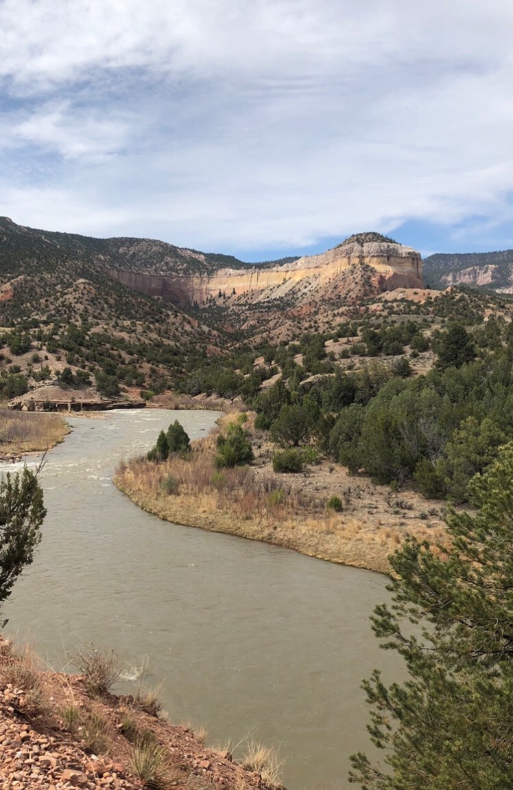 In the early morning we descended the Mesa at sunrise as the golden morning sun glints off red, orange, and columns in the distance. We climbed down into the Rio Chama valley through the Ojitos Canyon.