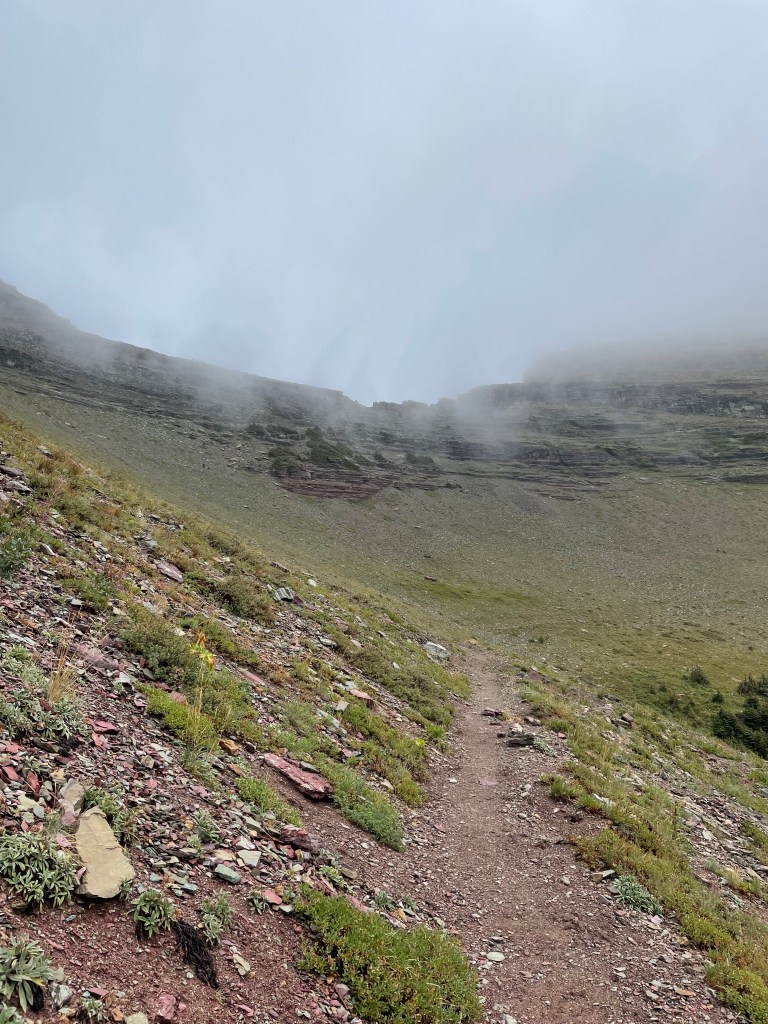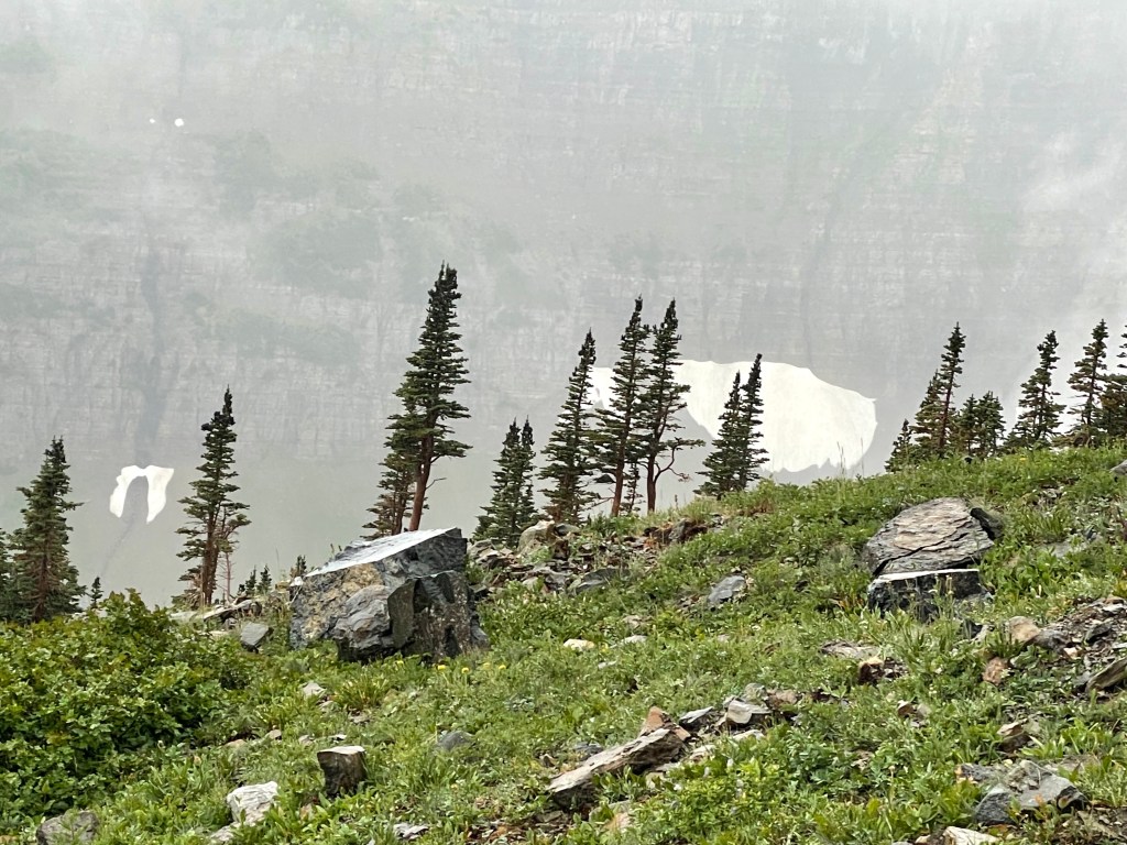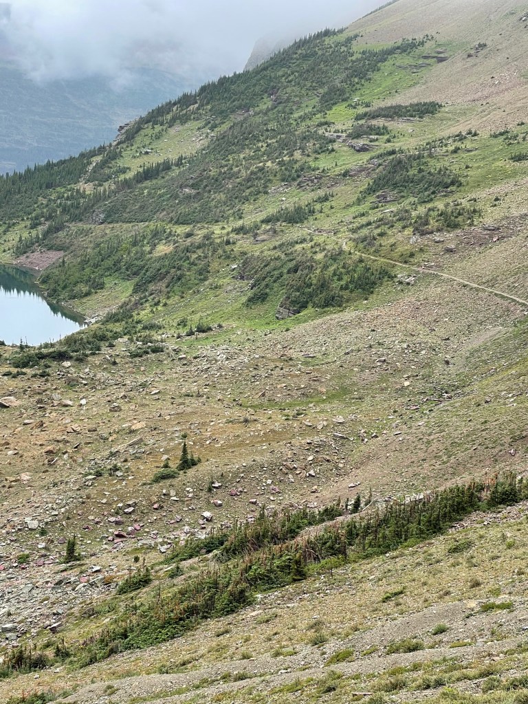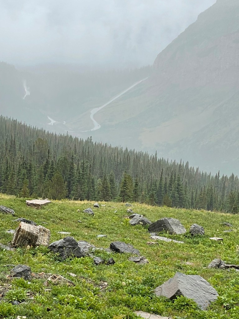 Before reaching the road where the trail crosses the Going to the Sun Road, it started to rain and this time I stopped and put on all my rain gear: rain coat, rain pants, rain glove covers. It rained all day. Sometimes lightly and other times heavily. I was happy my hiking pants, shirt, Smartwool layer, and gloves stayed dry all day underneath the rain gear.