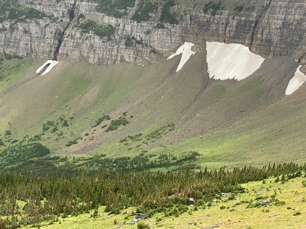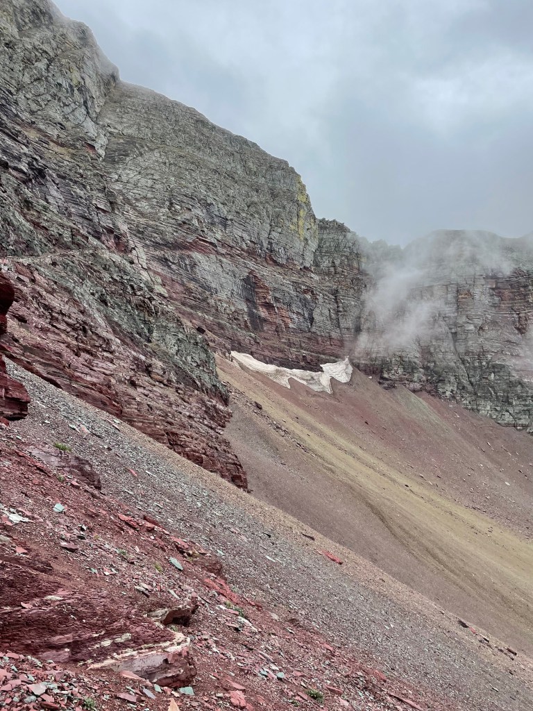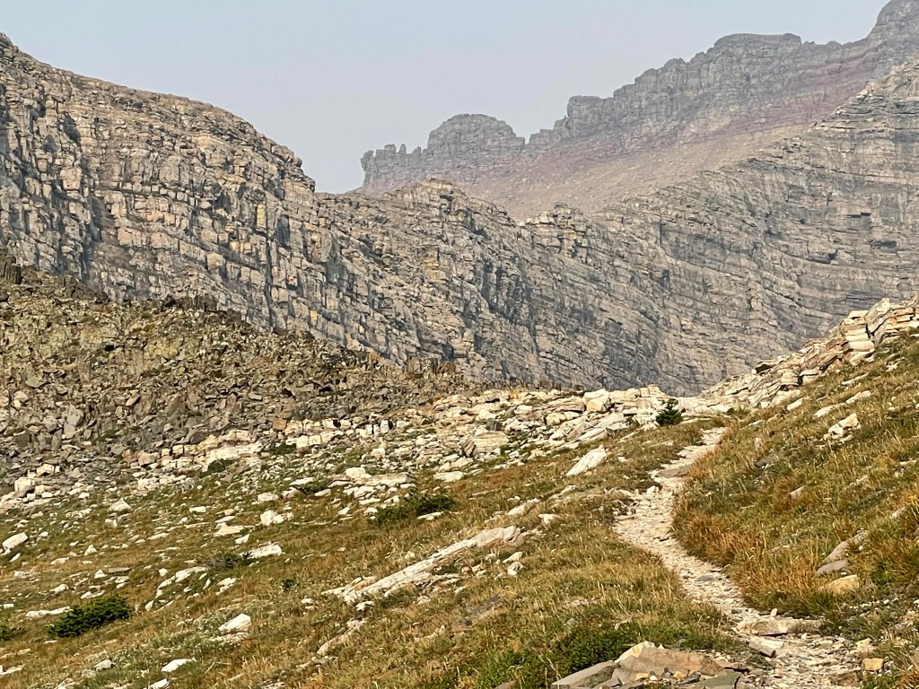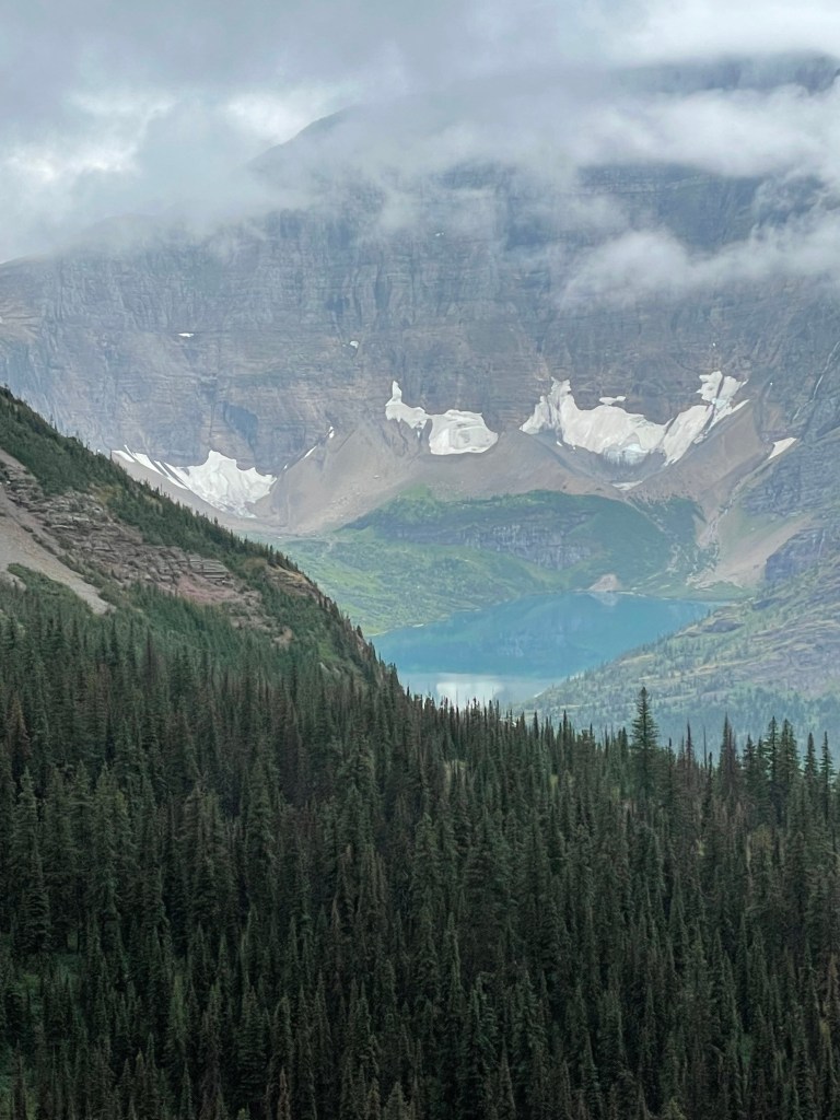Before reaching the road where the trail crosses the Going to the Sun Road, it started to rain and this time I stopped and put on all my rain gear: rain coat, rain pants, rain glove covers. It rained all day. Sometimes lightly and other times heavily. I was happy my hiking pants, shirt, Smartwool layer, and gloves stayed dry all day underneath the rain gear.