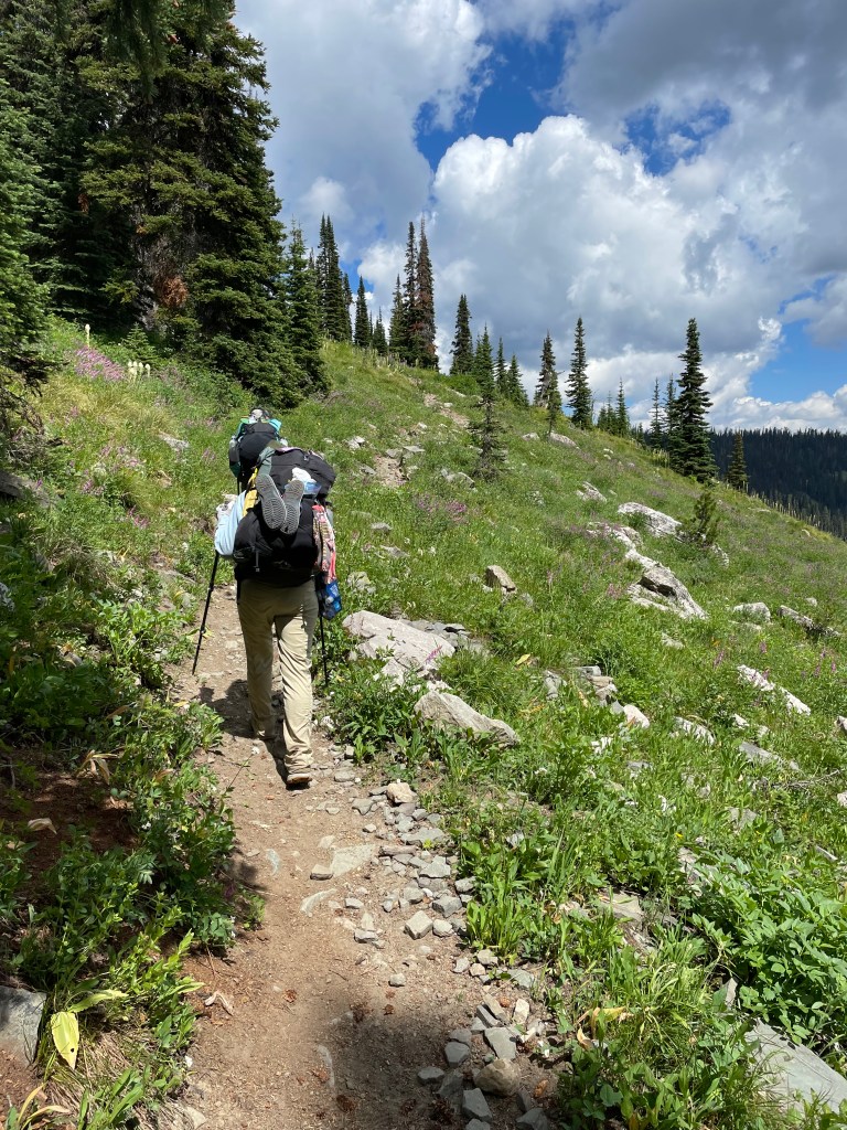 We hiked out of Rogers Pass and spent all day hiking uphill. We camped as soon as we neared the top dropping off the trail to a flat spot for our tents. It was an interesting night. Hyojin heard a large animal near our tents, perhaps a bear or deer. I was in the habit of leaving my socks hanging between the tent and the fly to air out in the night. During the night some small critter took one of my socks, a first for me. Lesson learned, never leave your socks outside of the tent.